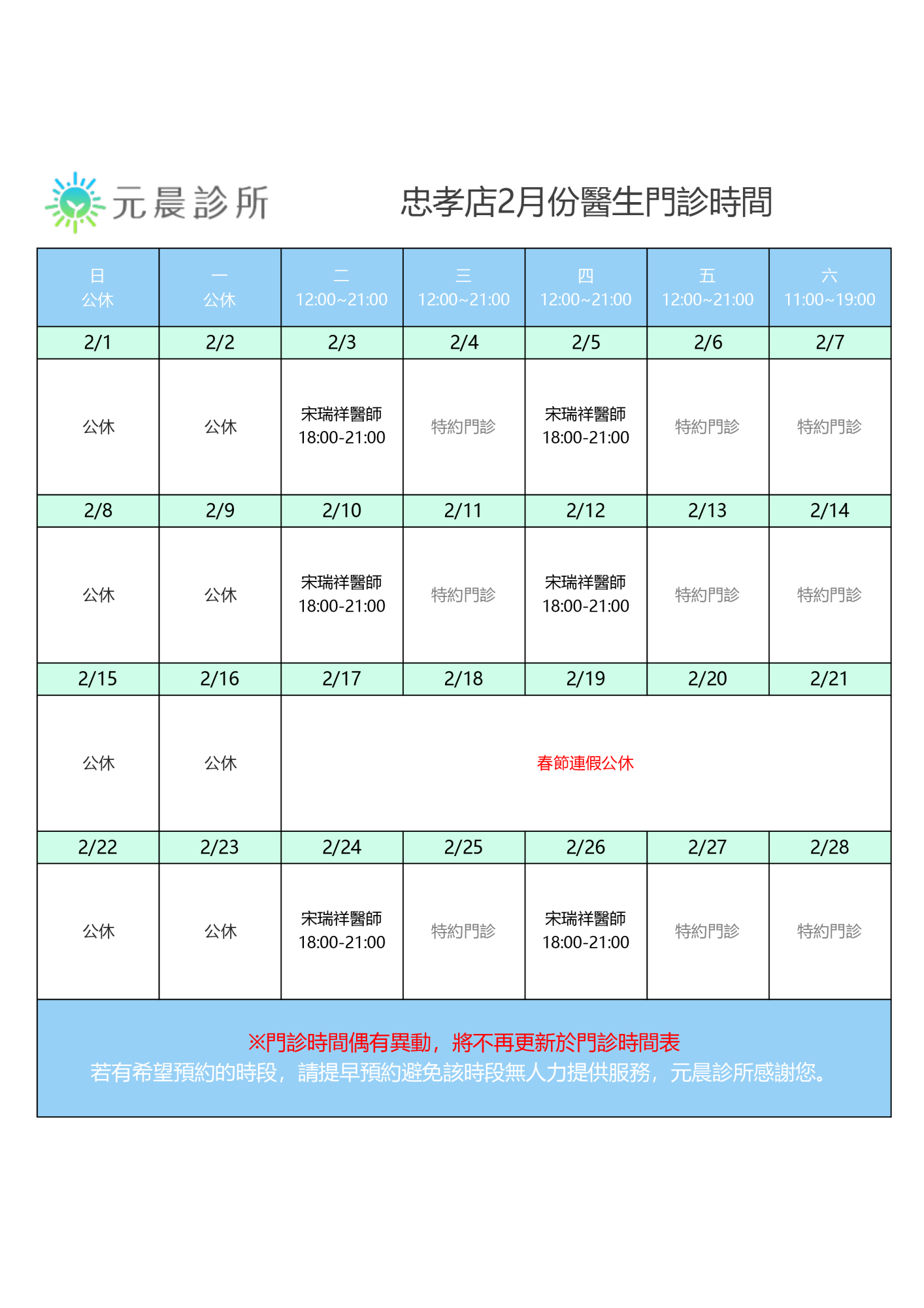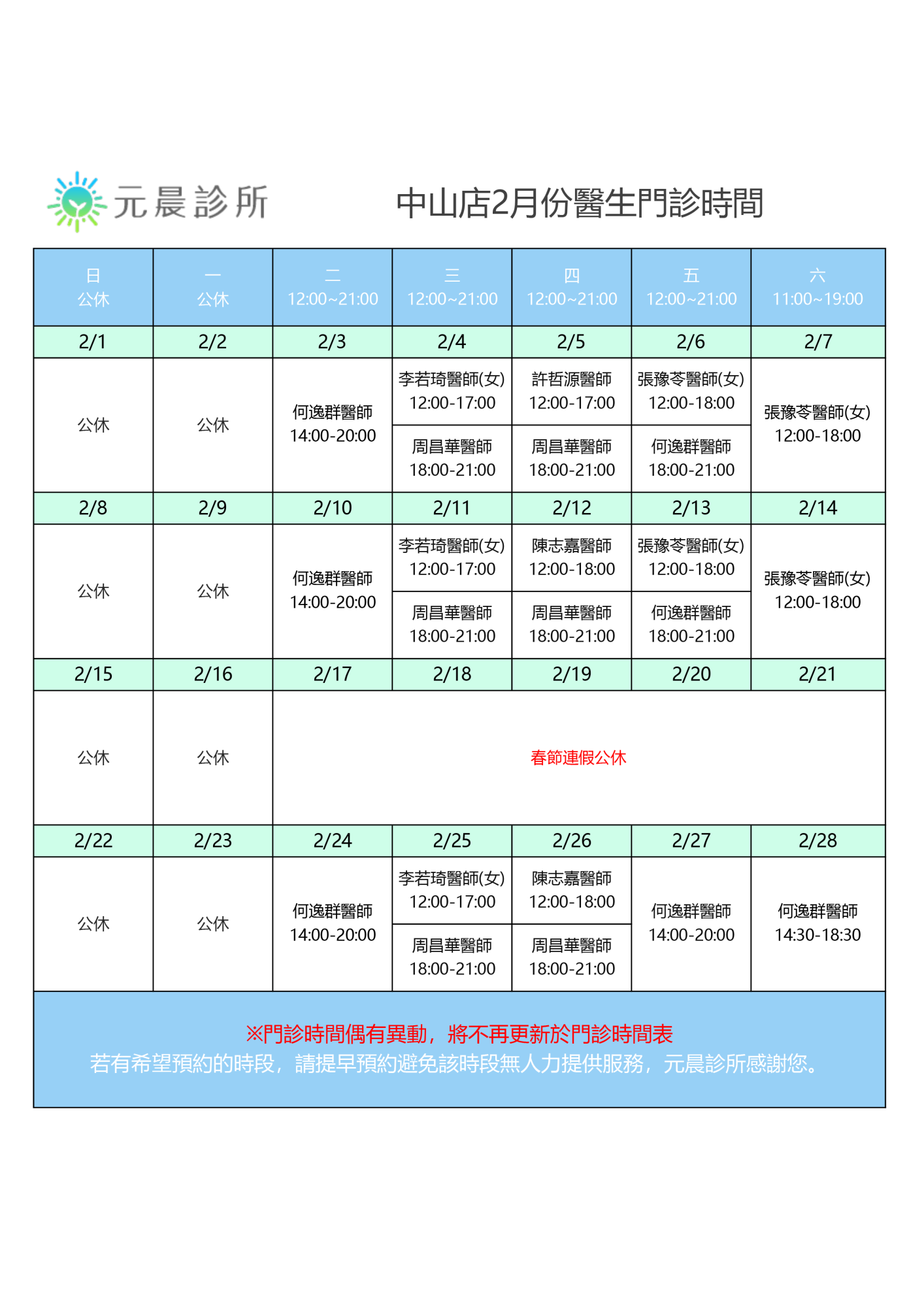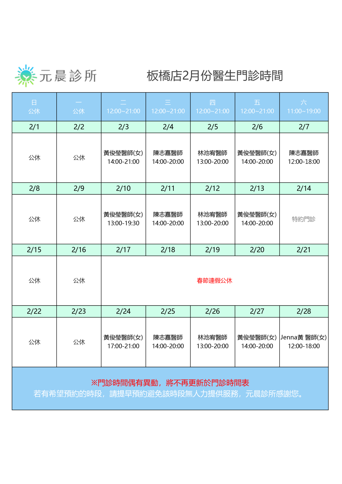 2月門診時間