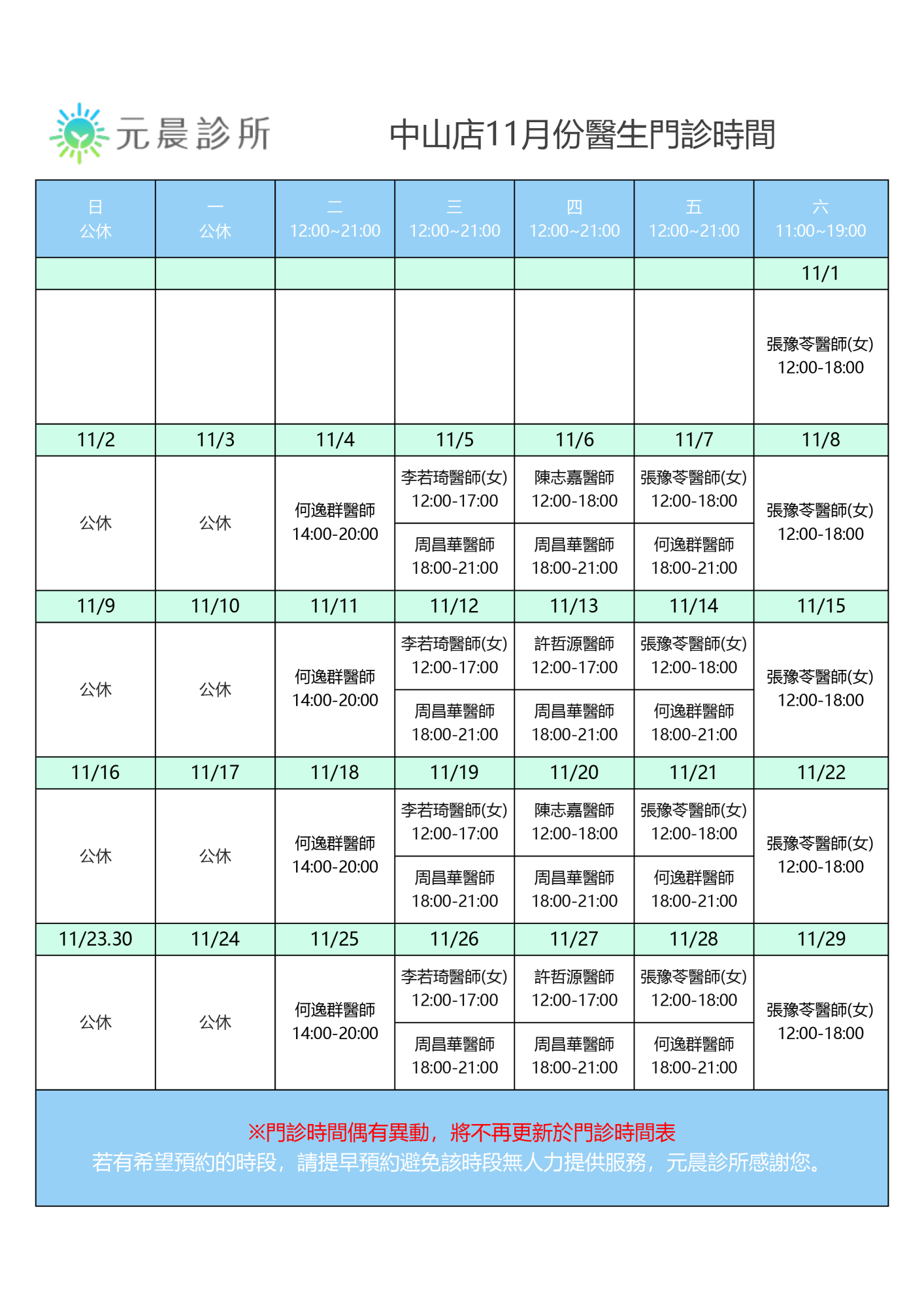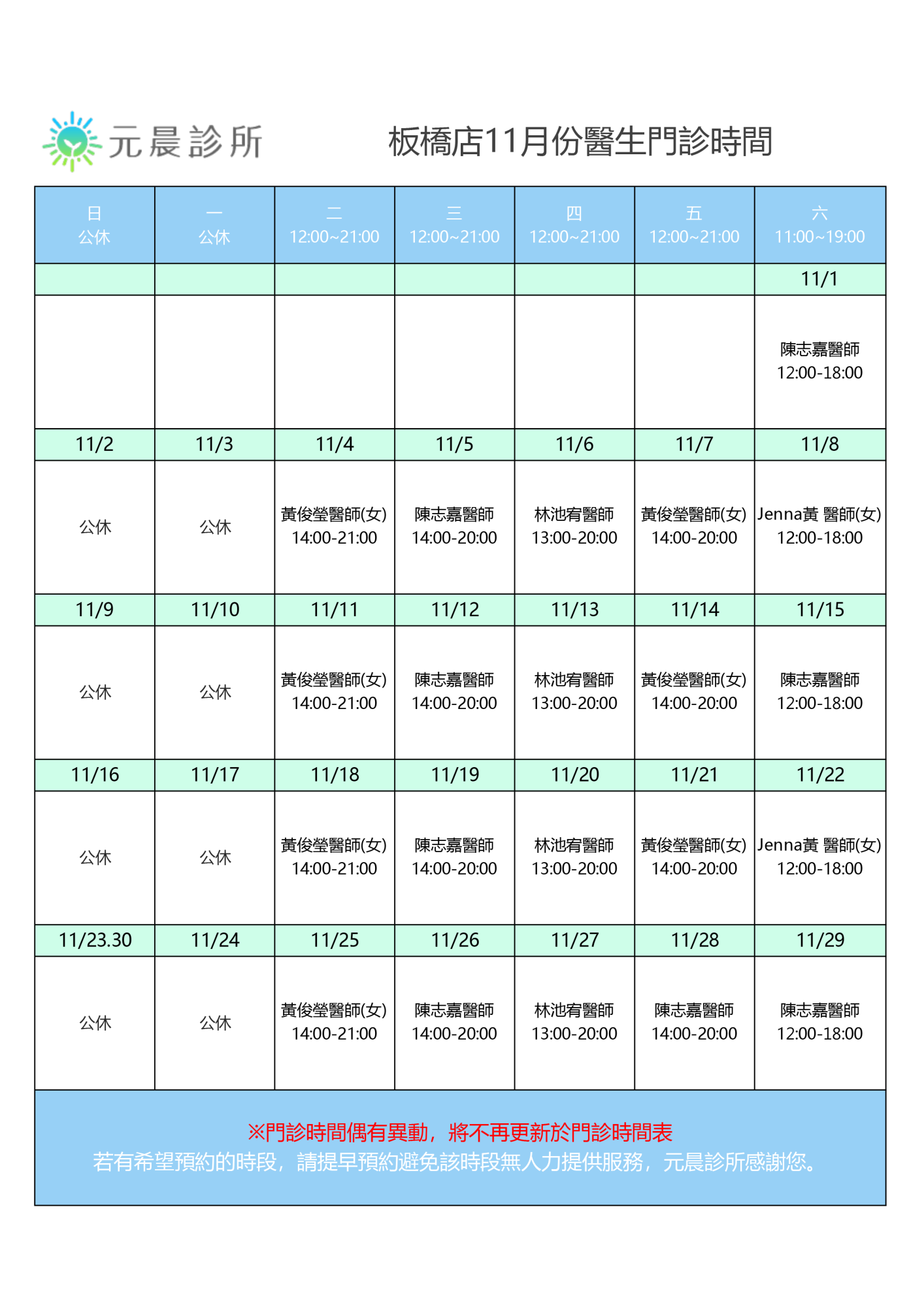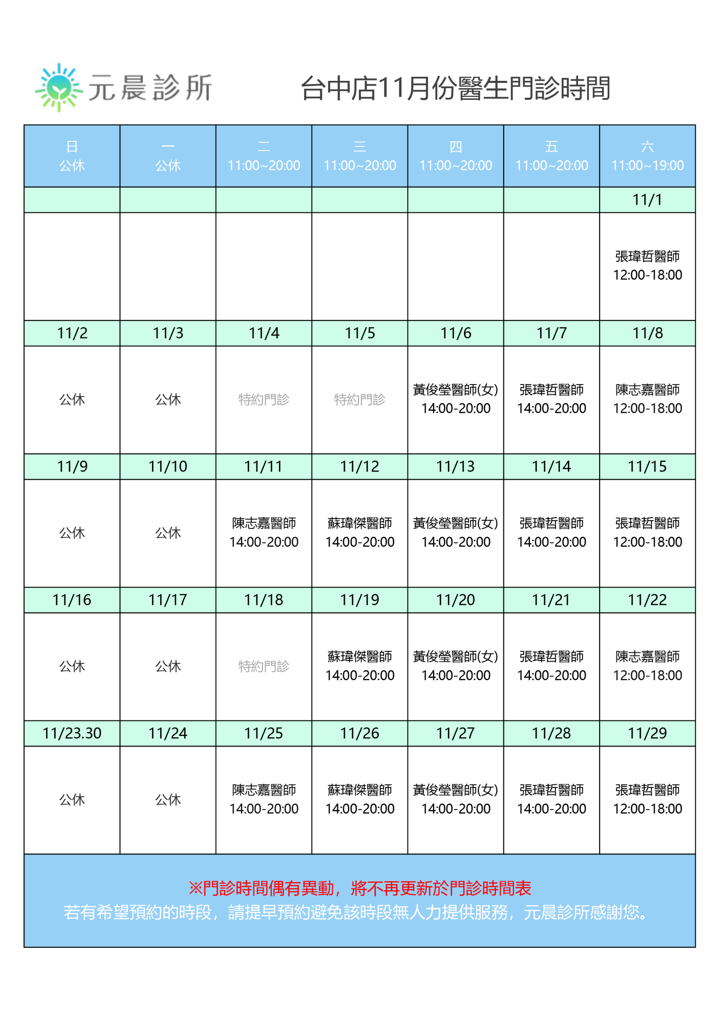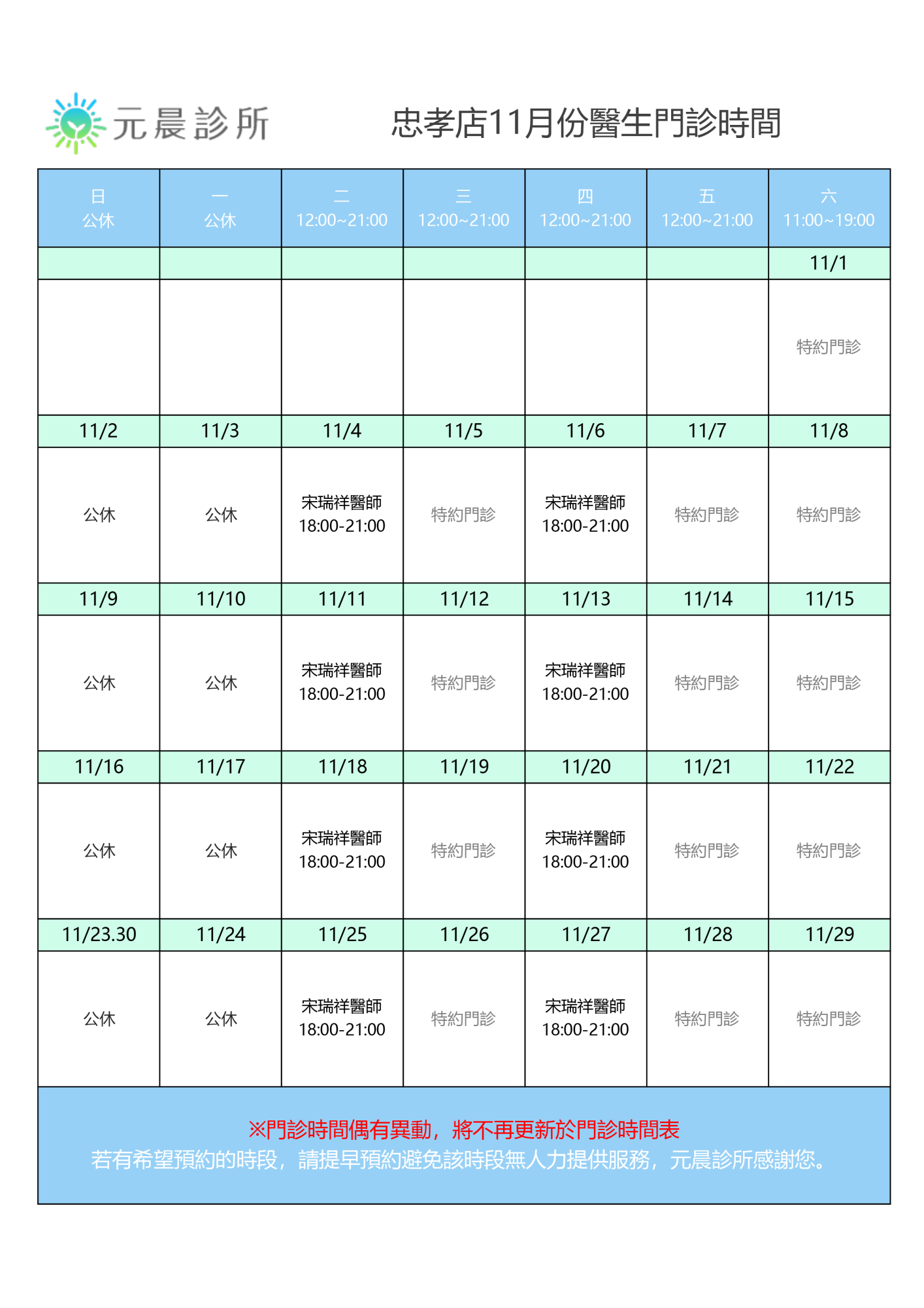 11月門診時間