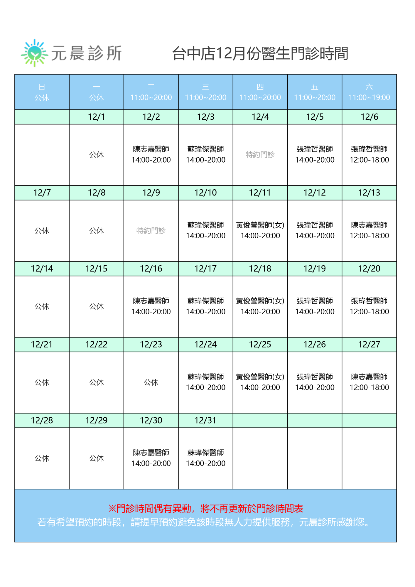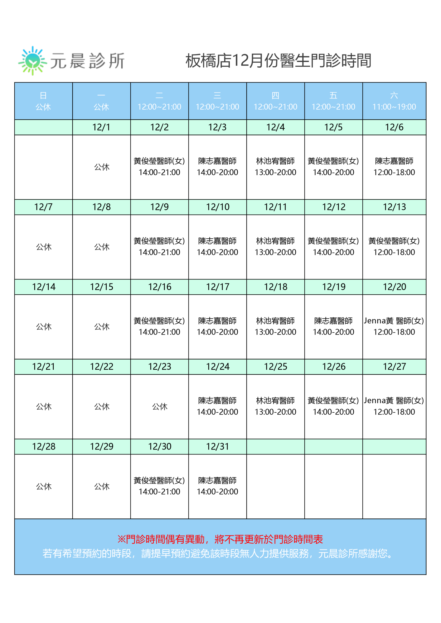 12月門診時間
