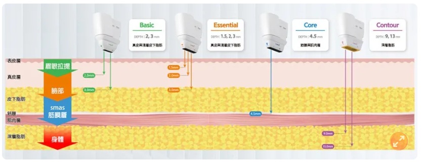 Z音波持續優化探頭與能量輸出技術,達到更靈活的治療深度選擇與更穩定的能量輸出。目前Z音波總共有 4 種類型探頭、搭配6 種治療深度(1.5 mm、2mm、3 mm、4.5mm、9mm、13mm),可變化出15種治療模式(點狀與線性),不僅能精確作用於皮膚表層,也可深入至皮膚的深層結構,醫師可以根據個案快速適切的模式,規劃客製化的療程,呈現自然的效果。